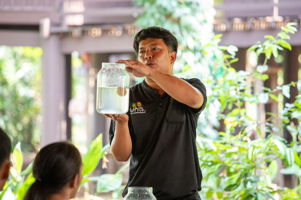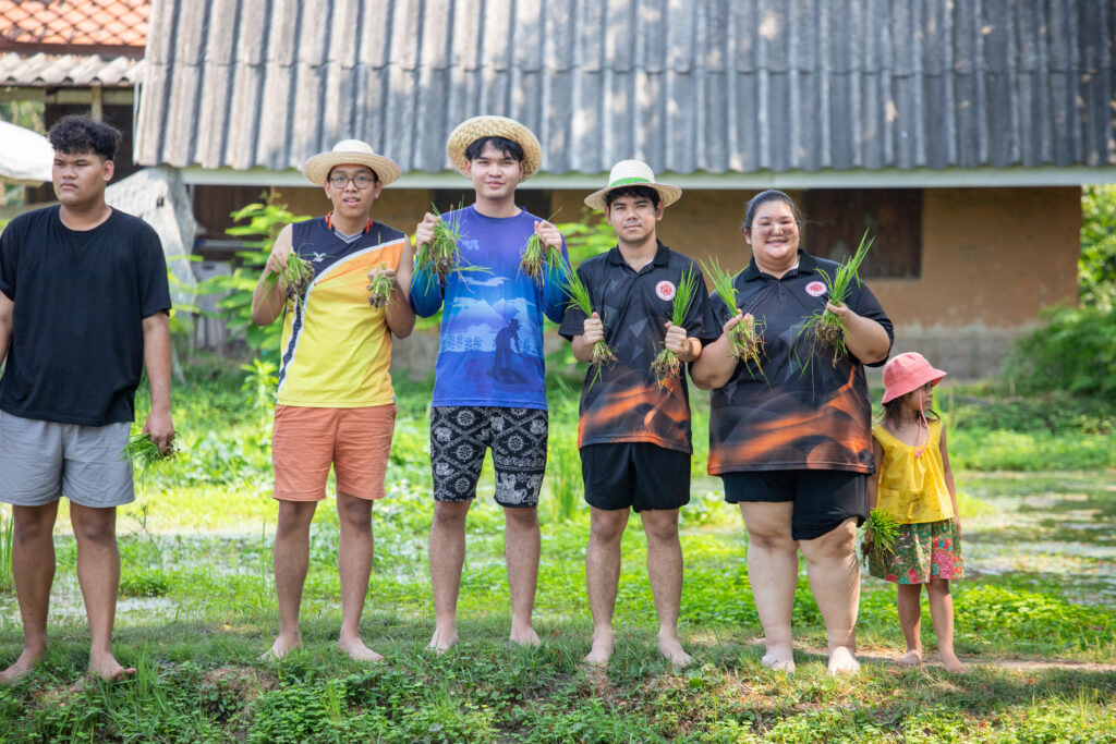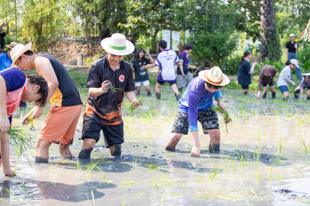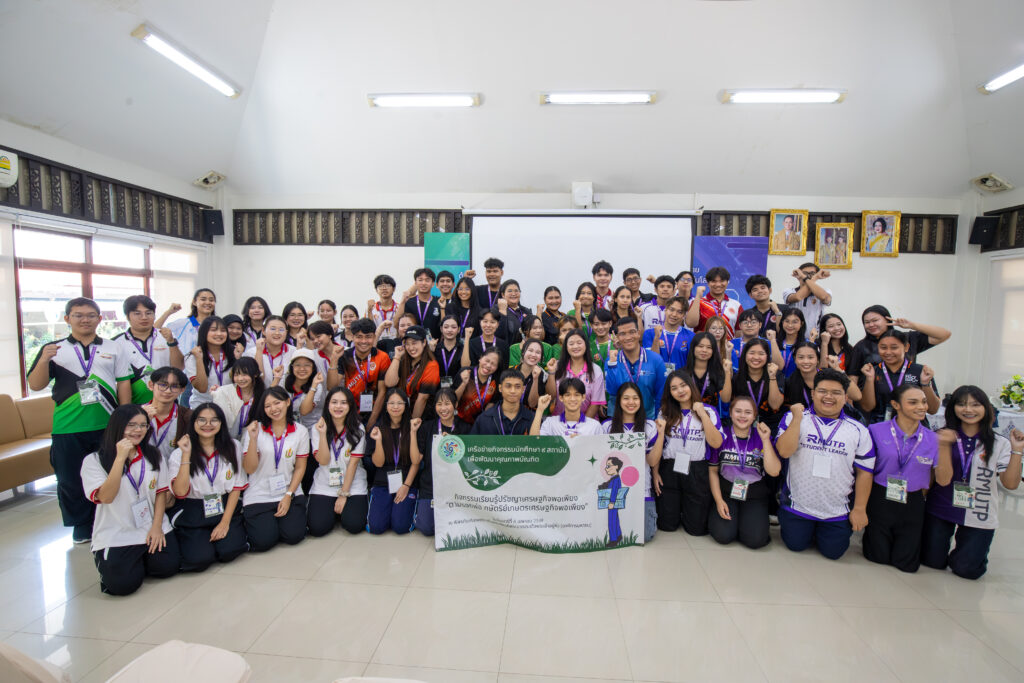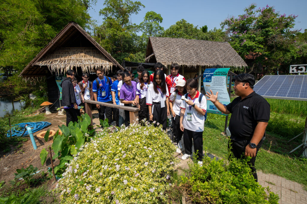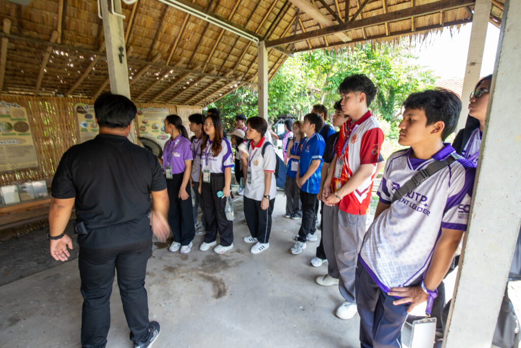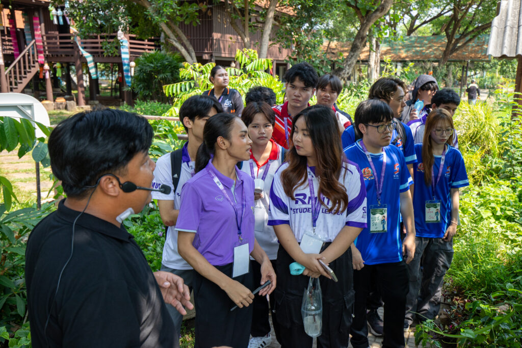 กิจกรรมเริ่มต้นขึ้นในช่วงเช้าด้วยการกล่าวต้อนรับและกิจกรรมนันทนาการเพื่อเตรียมความพร้อม ก่อนที่คณะผู้นำนักศึกษาจะได้ลงพื้นที่สัมผัสประสบการณ์จริงใน พิพิธภัณฑ์กลางแจ้ง โดยได้เรียนรู้ภูมิปัญญาและนวัตกรรมเพื่อการพึ่งพาตนเอง ผ่านฐานการเรียนรู้ต่างๆ ได้แก่ บ้านนวัตกรรมพลังงาน บ้านดิน บ้านฟาง และโมเดลการจัดการพื้นที่ “1 ไร่พอเพียง” ไฮไลต์สำคัญของช่วงเช้าคือ การลงมือปฏิบัติจริงในฐานฝึกทำเกษตรเศรษฐกิจพอเพียง ซึ่งนักศึกษาได้ร่วมกันลุยโคลน ทำนาดำและนาโยนกล้า สัมผัสวิถีชีวิตเกษตรกรอย่างใกล้ชิดและสนุกสนาน
