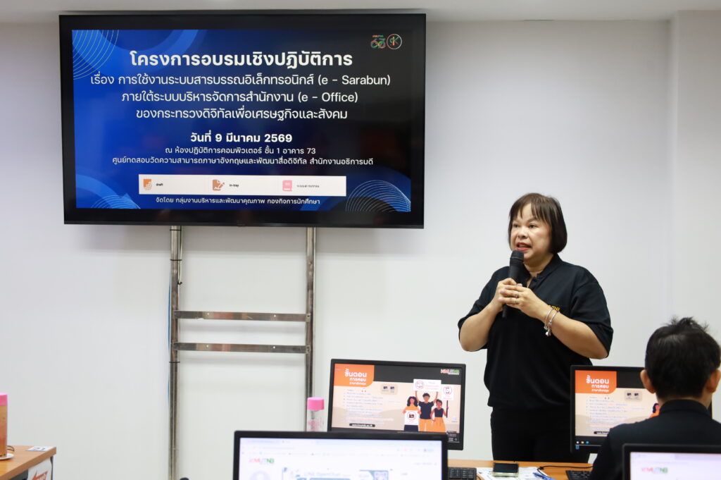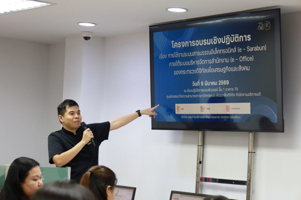 กองกิจการนักศึกษา จัดโครงการอบรมเชิงปฏิบัติการ เรื่อง การใช้งานระบบสารบรรณอิเล็กทรอนิกส์ (e – Sarabun) ภายใต้ระบบบริหารจัดการสำนักงาน (e – Office) ของกระทรวงดิจิทัลเพื่อเศรษฐกิจและสังคม วันจันทร์ที่ 9 มีนาคม 2569 ณ ห้องปฏิบัติการคอมพิวเตอร์ ชั้น 1 อาคาร 73 ศูนย์ทดสอบวัดความสามารถภาษาอังกฤษและพัฒนาสื่อดิจิทัล สำนักงานอธิการบดี